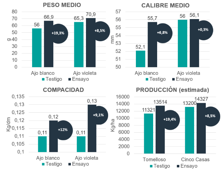 - Ajo blanco: aumento productivo de 2193 kg/ha.