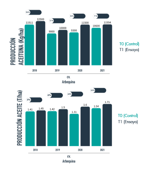 - Aumenta la producción de aceitunas y aceite de forma constante durante diferentes años de cultivo (diferentes condiciones climáticas)